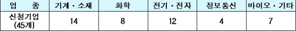 업종별로는 기계․소재가 14개사로 가장 많고, 화학 8개사, 전기․전자 12개사, 정보통신 4개사, 바이오․기타 7개사 등으로 집계됐다.