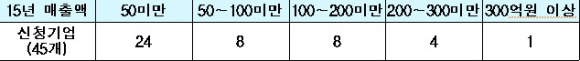 기업규모별로는 매출액 50억원 미만 기업이 24개사로 가장 많고 300억원 이상 기업까지 다양하게 분포되어 있다.