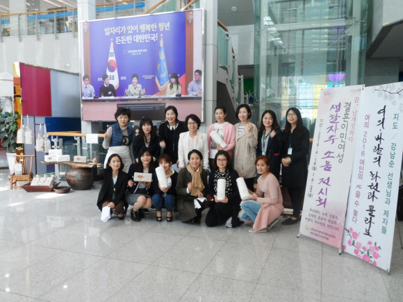 전시회 작품은 결혼이민여성의 취·창업을 돕고자 여의 패션디자인 학원(대표 이상임)의 후원과 강사 강남순의 지도로 지난 2월 18일부터 4월 14일까지 자수교육을 받은 10명의 결혼이민여성이 만든 쿠션, 앞치마, 윷놀이판 등 한국생활자수 소품 40여점이다.