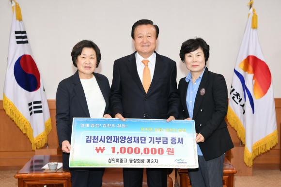 |  | | | ⓒ GBN 경북방송 | | 김천의 교육발전과 글로벌 인재육성을 위해 성의여중고 이순자 동창회장이 김천시인재양성재단(이사장 박보생)에 장학기금 1백만원을 기탁했다.