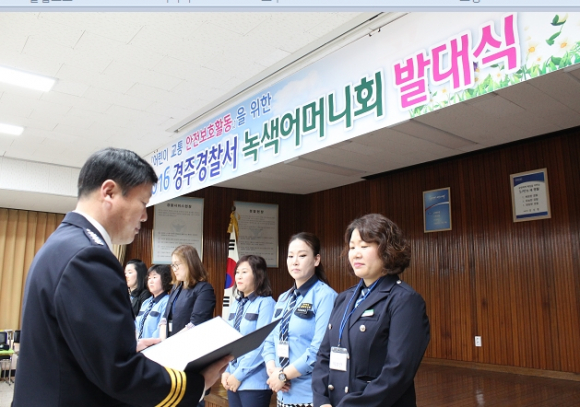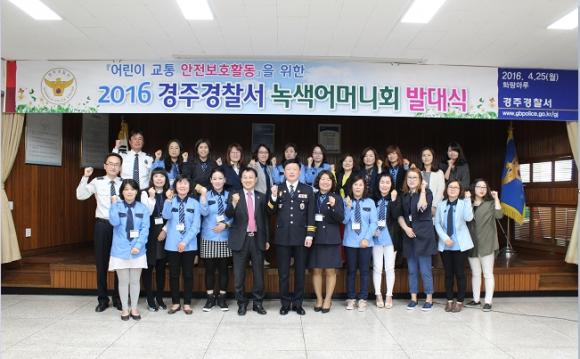 경주경찰서(서장 정흥남)는 25일 경찰서 별관 화랑마루에서 ‘2016년 경주경찰서 녹색어머니회’발대식을 개최하여 녹색어머니회원을 재정비하고 정식활동의 시작을 알렸다. 이날 발대식에는 구종모 경주교육지원청 교육장, 경주시청 도병우 도시개발국장, 녹색어머니회 임원진 및 회원 등 40여명이 참석한 가운데 전년도 유공자에 대한 감사장, 신임 임원진 위촉장 수여, 2015년 녹색어머니회 활동영상, 격려사 등의 절차로 진행됐다.