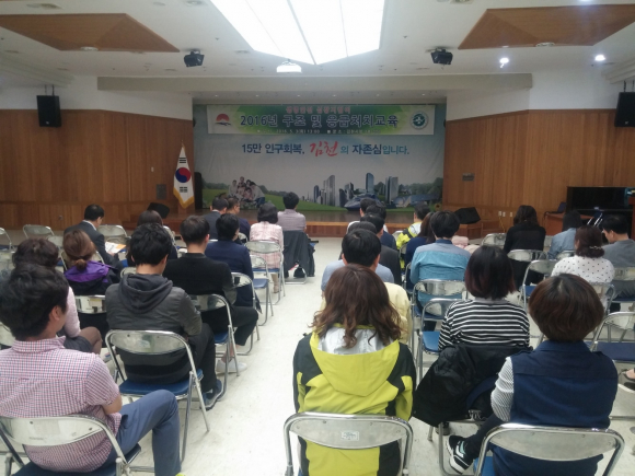 김천시는 5월 3일 김천시청 3층 강당에서 응급상황에 대한 올바른 대처·관리 능력향상을 위한 『구조 및 응급처치교육』을 병원 구급차기사, 기업체 안전관리자, 공무원 등 200여명을 대상으로 심폐소생술 전문강사를 초빙하여 실시하였다.