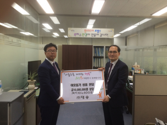 지역 건설업체 ㈜대송(대표 권동욱)이 가정의 달을 맞이 4일 포항시 주민복지과를 방문해 관내 저소득층 500세대에게 전달될 이웃돕기 사랑의 쌀10㎏ 500포를 기탁했다.