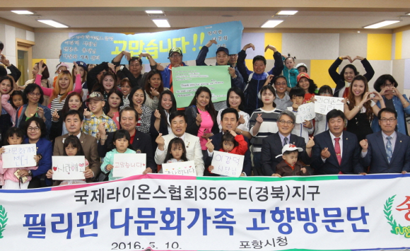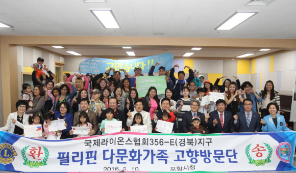 10일 국제라이온스협회 356-E(경북지구 총재 천장우)와 포항시다문화가족지원센터(센터장 윤영란 여성가족과장) 필리핀 자조모임은 필리핀 다문화가정 20가정(50명)의 모국방문 발대식 행사를 포항시장을 비롯한 내빈들이 참석한 가운데 센터 1강의실에서 열었다.