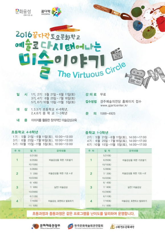 (재)경주문화재단(이사장 최양식)은 2016 경주예술의전당 꿈다락토요문화학교 <예술로 다시 태어나는 미술이야기>를 5월 21일 오픈한다고 밝혔다.