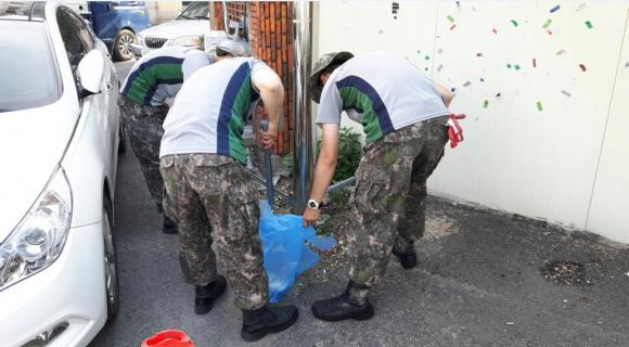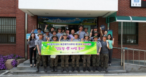동천동주민센터와 육군제7516부대 제1대대는 20일 동천동 관내 경로당을 방문하여 환경정비 등 봉사활동을 실시했다. 이번 봉사활동은 동천동주민센터와 육군 제7516부대 제1대대가 올해 1월에 체결한 MOU사업의 일환으로 지난 2월에 이어 2번째 봉사활동을 펼쳤다.