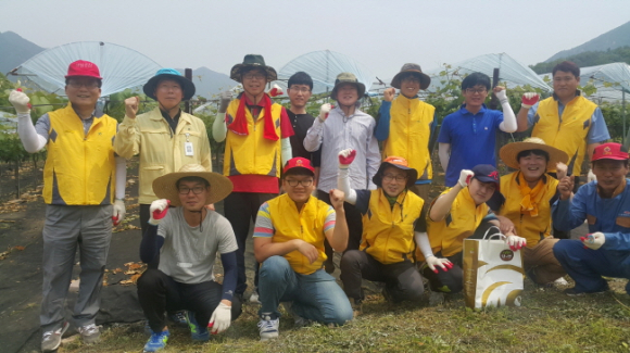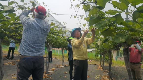 상주시 화북면(면장 최정섭)에서는 봄철 영농기를 맞아 5월 31일 장암리 이홍조(57세)씨 포도밭에서 시청 산림녹지과와 면 직원 등 20여 명이 참여한 가운데 포도 곁순제거 및 포도가지 결속 등 영농작업에 구슬땀을 흘렸다.