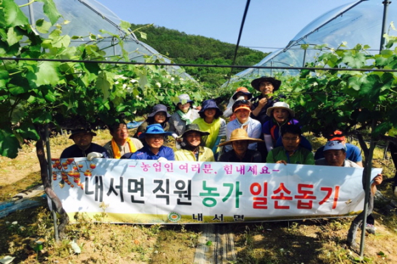 일손돕기는 지난 5월초 강풍피해로 간이비가림 재배시설 비닐파열 및 고령농가로 농작업에 어려움을 겪고 있어 면직원과 보건소 직원 20여 명이 적기영농을 지원했다.
