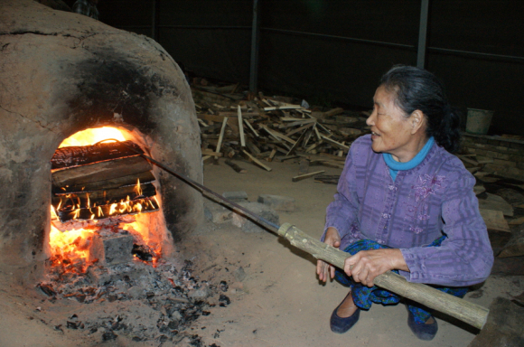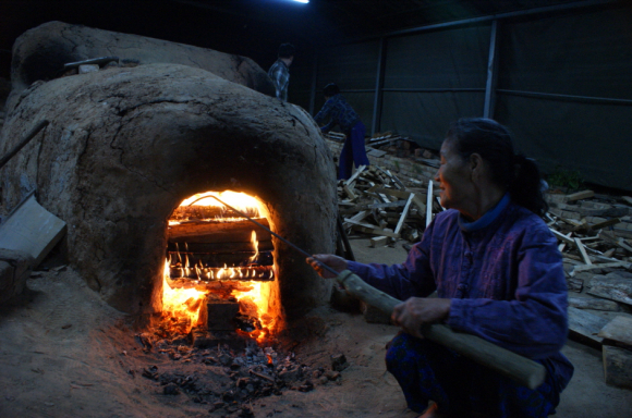 14일 오전. 불 지핀지 이틀이 경과했다. 그러나 불꽃은 어제와 별로 달라진 것이 없어 보인다. 장작불이 2단으로 올라갔으며 가마 중앙부에 따뜻한 기운이 만져진다. 조금 두꺼워진 불이 가마의 좌우 벽으로 흘러들어가고 있다.