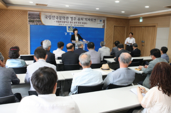 1일 경주시문인협회, 경주예총, 경주문화원 등 지역 예술계는 물론 경제계, 시민사회계 등 각계각층의 대표들이 시청 브리핑실에서 기자회견을 열고 경주유치 당위성을 담은 14개항을 담은 건의문을 발표하고 우리나라 향가와 설화의 본고장이자 정신문화의 본고장인 경주에 반드시 유치되어야 함을 강력히 주장했다.
