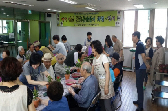소백야생화연구회원들이 준비한 석죽, 만델빌라 모종을 활용하여 40여명의 노인들과 야생화 화분만들기 체험을 실시하고 화분을 이용해 센터 내 힐링 치유의 공간을 조성했다.