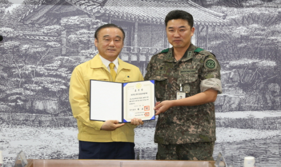 특히 경주시통합방위협의회는 지난 4월 지역통합방위 유공으로 국무총리 표창을 수상하였으며 이날 표창장을 이재현 7516부대 대대장이 최양식 경주시장에게 전수 했다.