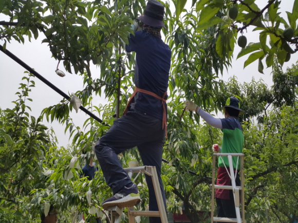 김천시 문화예술회관(관장 장귀희) 직원들이 지난 9일 양천동 복숭아 농가(농장주 박희동)를 찾아 봉지 씌우기로 하루를 보냈다.