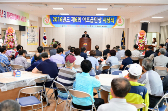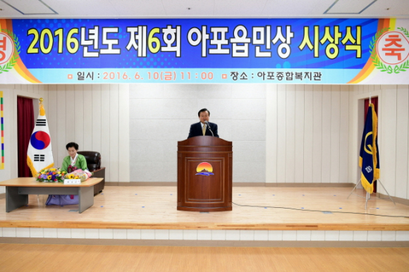 김천시 아포읍에서는 읍민화합과 지역사회 발전을 위해 헌신‧봉사해온 읍민에게 수여하는 아포읍민상 시상식을 2016년 6월 10일 아포읍종합복지관 2층 강당에서 개최했다.