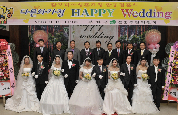 봉화군에서는 3월 13일 군청 대회의실에서 캄보디아 결혼추진 5쌍에 대한 합동결혼식을 결혼추진위원장의 주례와 700여명의 친지, 동료, 기관 단체장들의 축복으로 거행되었다. 봉화군은 전국 최초로 결혼추진위원회를 구성하여 관내 거주 만30세 이상 만49세 이하 총각들을 대상으로 직접 대상자 선정, 중매, 맞선에 이어 결혼식에 이르기 까지 결혼전반을 추진해오고 있다. 특히 이번에 합동결혼식을 올리는 5쌍은 봉화군에서 추진한 ´09년 2차 캄보결혼추진 대상자들로서 1인당 결혼추진 비용 600만원을 봉화군예산으로 지원하고 캄보디아 현지 결혼지원사무소의 협조로 결혼의 결실을 맺게 되었다.
