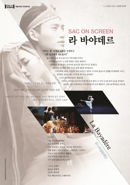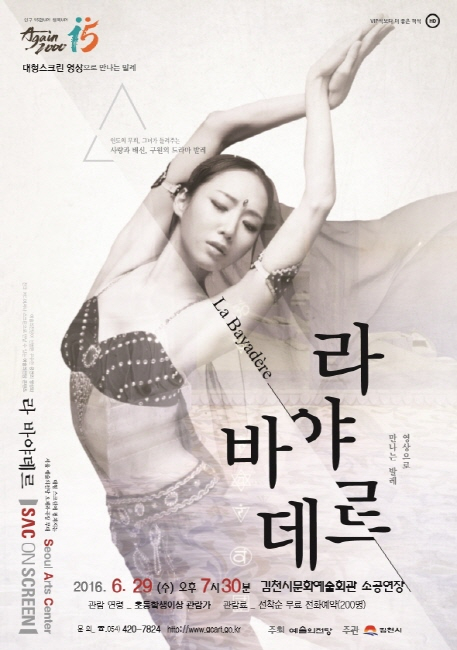 김천시문화예술회관(관장 장귀희)에서는 2016. 6. 29일(수) 오후 7시30분 문화가 있는 날을 맞이하여 ‘SAC on Screen’ (공연영상화 사업)의 일환으로 서울 예술의 전당에서 제공한 영상『라 바야데르』를 소공연장에서 상영한다.