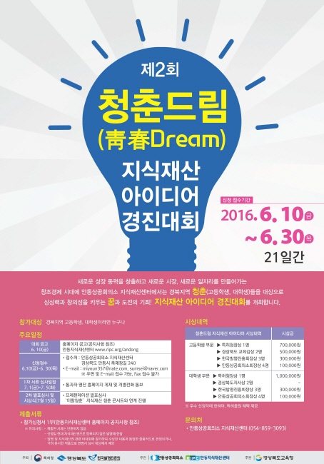 안동상공회의소 안동지식재산센터(회장 이경원)는 지역 학생들의 창의적인 아이디어를 발굴하여 지식재산 권리화를 지원하기 위한 ‘제2회 청춘드림(靑春Dream) 지식재산 아이디어 경진대회’를 개최한다.