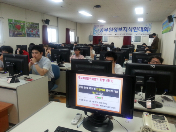 이번 대회는 정부 3.0시대를 이끌어 갈 핵심 정보지식 공무원을 양성하고 김천시의 정보화 역량 개발을 촉진하여 시민에게 맞춤형 서비스를 제공하기 위한 자체평가 대회로 부서별 2명씩 총 110여명이 참가했다.