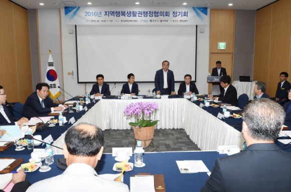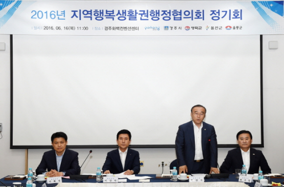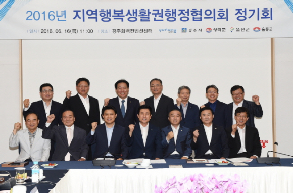 16일 경주 하이코에서 최양식 경주시장과 이강덕 포항시장, 이희진 영덕군수, 최수일 울릉군수, 김성현 울진부군수를 비롯해 5개 시·군 민간위원 등 50여명이 참석한 가운데 ‘지역행복생활권행정협의회’ 정기회의를 가졌다.
