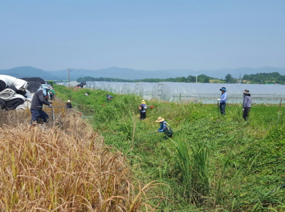 성주읍 용산1리(이장:전수일)에서는 6월 17일(금) 이른 새벽부터 마을 주민 30여명이 힘을 모아 장마철 대비 배수로 정비를 실시했다. 참외 수확 등 바쁜 농사철에도 불구하고 용산들 중앙 배수로에 무성하게 자란 잡풀 등을 손수 예취기를 들고 제거하고, 배수로 기능을 저해시키는 보온덮개 및 쓰레기를 치우는 등 내 들녘 깨끗이 하기와 배수로 정비를 함께 실시했다.