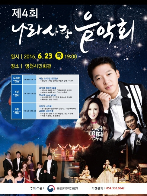 국립영천호국원(원장 김종민)은 6월 23일(목) 19시 영천시민회관에서 “제4회 나라사랑 음악회”를 개최한다.