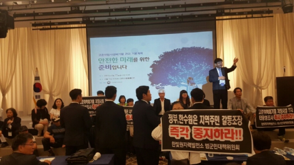 지난 17일 오전 8시 산업자원부는 서울 더케이호텔에서 '고준위방폐장 기본계획안' 공청회를 시도했으나 원전지역인 경주, 영광, 고창, 부산 등에서 상경해 강한 반발이 있어 국민의례만 하고 무산되었다.