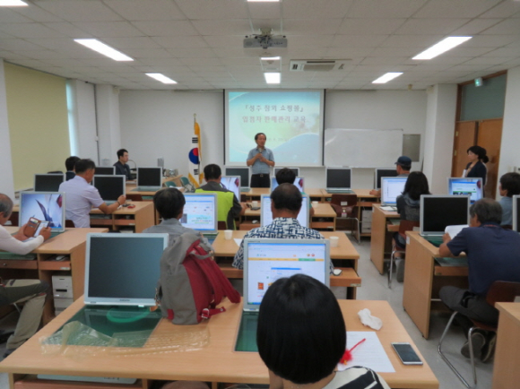 입점자 판매관리교육은 신규 입점농가 15농가(참외6, 과실4, 버섯1, 특용3, 가공1) 및 기존 입점자 중 희망 농가를 대상으로 실시하였으며, 쇼핑몰운영업체 (주)유비엔에서 쇼핑몰 입점절차, 판매 페이지 관리 및 고객응대, 운영 및 정산체계, 유의사항 등 운용 노하우에 대해 2시간에 걸쳐 교육 받았다.