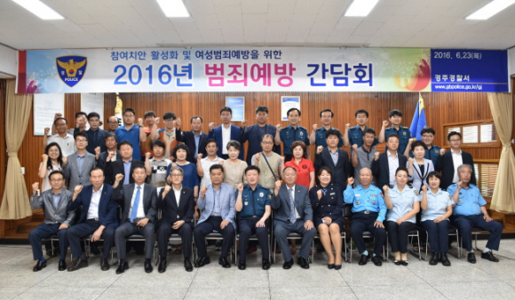 경주경찰서(서장 정흥남)는 16. 6. 23(목), 경주경찰서 대회의실에서 참여치안 활성화 및 여성범죄예방을 위한 경찰협력단체인 자율방범대, 생활안전연합회, 시민경찰, 모범운전자회, 녹색어머니회, 이ㆍ통장 협의회 및 경주시 관계자 등 50여명이 함께 참석한 가운데 참여치안 활성화 및 여성범죄예방을 위한 2016년 범죄예방 간담회를 가졌다.