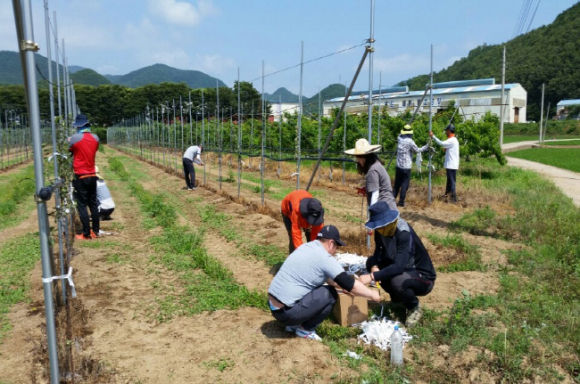 이날 농가를 방문한 직원들은 고품질의 사과를 생산하기 위해서는 웃자람을 방지하고 열매가 많이 달려도 찢어지지 않도록 어린 사과나무 가지를 묘목지주에 묶어주는 작업에 때이른 무더운 속에서도 일손을 지원하며 구슬땀을 흘렸다.