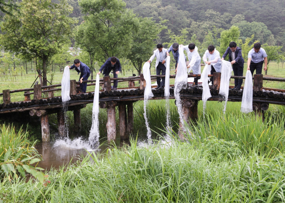 영양군(군수 권영택)은 6월 24일(금) 13시 30분 영양읍 삼지연꽃테마공원 및 관내 주요하천에 다슬기 93만 7천패(貝), 메기 15만미, 쏘가리 1만미를 방류 하는 등 내수면 수산자원 확보와 토종생태계 보존에 힘쓰고 있다.