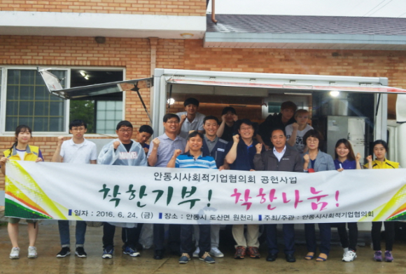안동시 사회적기업협의회(회장 박경구)에서는 지난 24일 기업대표와 봉사자가 참여한 가운데 도산면 원천리에서 사회공헌사업을 펼쳤다. 이날은 전날부터 내린 비가 그치지 않아서 봉사활동을 연기해야 하지 않을까 하는 기우가 무색하게 안동시 사회적기업협의회에서는 처음 계획 인원 30여명 보다 훨씬 더 많은 55명이 참여했다. ㈜나우에서는 마을주민의 안전을 위해 경로당에 CCTV 무료 설치와 함께 낡은 전기스위치를 무료로 교체해줬다. 또 ㈜돌봄사회서비스센터에서는 이동세탁차를 지원 손빨래가 어려운 이불과 옷 등을 세탁해줬고 ㈜할매손나눔푸드에서는 밥차를 지원해 마을주민들에게 따뜻한 식사를 대접했다. |  | | | ⓒ GBN 경북방송 | |
