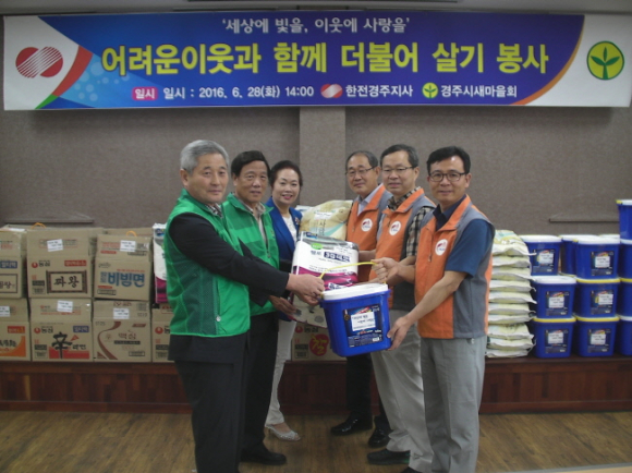한국전력 경주지사 사회봉사단(단장 곽병철)와 경주시새마을회(회장 박서규)에서는 2016년 6월 28일(화) 14시 경주시새마을회관 4층 대회의실에서 어려운이웃과 함께 하기 위해 사랑의 물품 전달식을 했다.