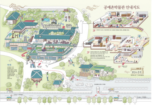 특히 영상실은 명인의 작품과정을 상영하고 지난날 모습들을 현실감 있게 재현한 포석정에는 가야금과 북소리 국악이 울려 펴지고 남녀가 원 삿을 하는 즐거움 장독대에서 어니님이 수고하시는 모습을 따라 해보고, 전통혼례 체험과 정원길(길명: 사랑합니다)을 걸으며 사랑을 나누고 귀촌의 행복 코너는 새로운 삶의 시작을 알리는 건강한 가정을 재현했다
