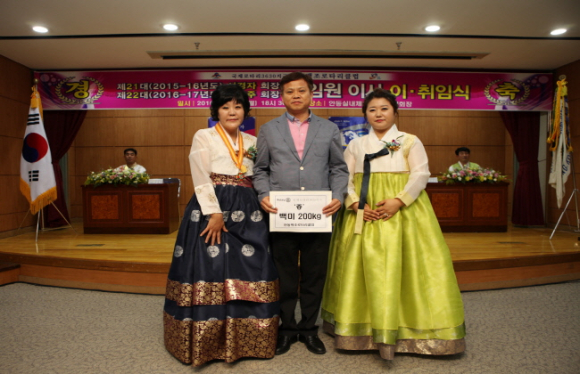 이취임식에서 축하화환 대신 받은 쌀 기탁