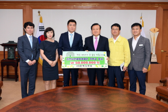 김천시 백년대계를 위한 우수인재육성에 기여하기 위해 (주)한백디엔씨(대표이사 조재봉)가 김천시인재양성재단(이사장 박보생)에 후원금 5천만원을 기탁했다.