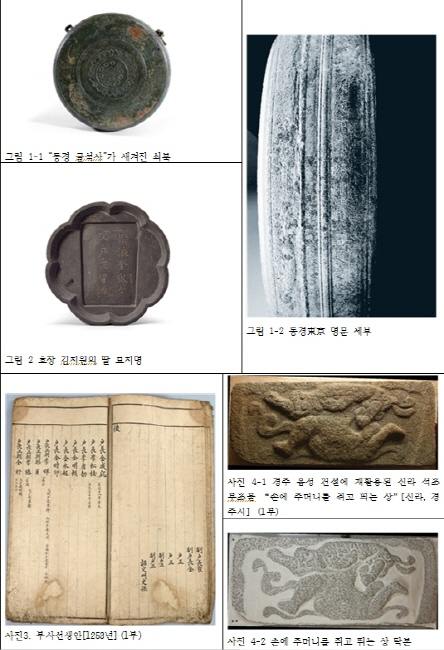 최신 발굴자료, 경주 읍성 출토품과 구정동 출토 쌍용무늬청동거울 첫 공개 최근 발굴조사가 이루어진 경주 읍성 및 구정동 고려무덤 출토품이 이번 전시에서 공개된다. 고려시대 경주 읍성 축조에는 옛 신라 궁궐 등 기존 건축물을 해체하여 얻은 석재들이 재활용되었다. 이 중 테두리에 안상眼象을 새겨 화면 틀처럼 삼고 가운데에 인물처럼 생긴 상을 조각한 통일신라기 부조가 주목할 만하다. 이러한 상은 중국 남북조시대 북위北魏(386~534) 말부터 동위東魏(534~550)를 거쳐 북제北齊(550~577)에 이르는 6세기 불교미술에서 불비상佛碑像의 하단에 새겨진 풍신왕風神王과 유사하다. 또한 서쪽 돈황 막고굴 중에서 서위西魏(535~556) 때 지어진 제285굴과 당唐(618~907) 초기인 7세기의 제329굴 천정 벽화에도 두 손으로 천을 쥐고 뛰는 역동적인 자세의 풍신風神이 그려져 있어 이와 비교된다. 경북대학교박물관 야외에 전시된 울산 출토 9세기 작 사암제 비로자나불좌상의 대좌 중대석에 이와 비슷한 신장상이 새겨져 있으나, 신라에서는 이 소재 자체가 흔치 않아 앞으로의 연구가 기대되는 신자료이다. 이와 함께 최근 출토된 경주 구정동 쌍용무늬구름무늬띠거울雙龍文雲文帶鏡은 고려의 도읍인 개성에서 주로 발견되는데, 거울에는 포장재로 사용된 대나무가 그대로 남아 있다.