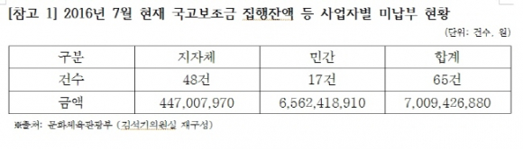 문화체육관광부, 회수 안 된 국고보조금만 70억원, 이중 민간사업자가 17건 65억 6,200만원, 회수방안 강구 시급해