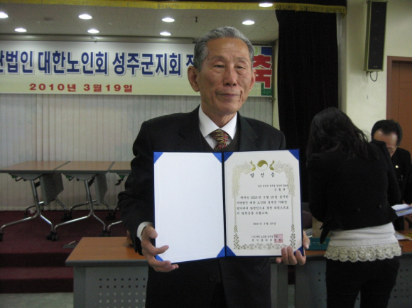 대한노인회성주군지회 제9대 회장에 신동규 성주군 행정동우회장이 당선됐다. 대한노인회성주군지회는 3월 19일 오전 10시 성주군노인회관 2층 대강당에서 2010년도 정기총회를 열고 대의원 239명 중 231명이 참석한 가운데 제9대 대한노인회성주군지회장 선거를 실시했다. 이날 오후 1시 개표결과 신동규 후보가 유효 231표(기권 8표) 중 171표(74%)를 얻어 현 회장인 김회년 후보(60표, 26.0%)를 제치고 당선됐다. 이날 선거는 오전 10시부터 진행된 정기총회에 이어 11시부터 손태수 대한노인회성주군지회 선거관리위원회 위원장의 진행에 따라 후보자별로 10분씩 할애된 정견발표에 이어 투표가 치뤄졌다. 신동규 당선자는 3월 19일 선거 직후 대한노인회성주군지회 선거관리위원회로부터 당선증을 전달받았으며, 4월 1일부터 4년 동안 대한노인회성주군지회를 이끌게 됐다. 한편 신동규(77세) 당선자는 부인 원근호(68세) 여사와 1남 1녀의 자녀를 두고 있다. |