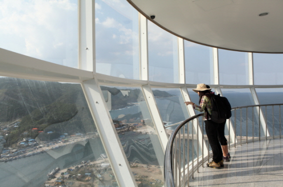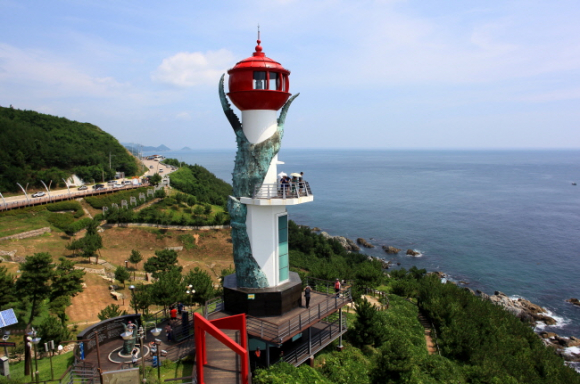 다음은 블루로드 B코스 '푸른 대게의 길‘ 종점의 축산항이다. 현수교 양식의 블루로드다리를 건너 죽도산 전망대에 오르자. 안으로는 아름다운 축산항이, 밖으로는 망망대해가 모두 그림이다. 전망대 카페에서 연인과 커피 한 잔하는 여유도 좋다.