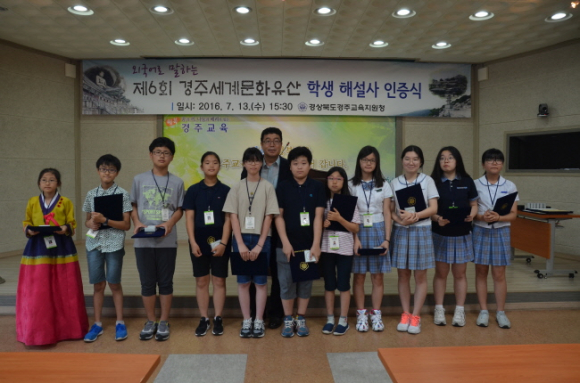 경상북도경주교육지원청(교육장 구종모)은 7월 13일(수) 15시 30분 교육지원청 3층 대회의실에서 제6회 경주세계문화유산 학생 해설사 인증식을 실시했다.