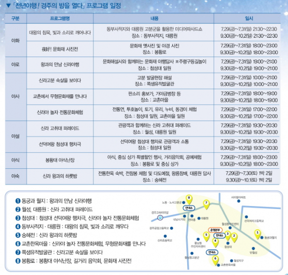 ‘천년야행! 경주의 밤을 열다’라는 주제로 세계유산 등재지역 및 문화재 밀집지역을 거점으로 문화를 소개하는 ‘7야(夜) 야행프로그램을 선보인다. 7야(夜)는 야로(夜路, 서라벌을 노닐다), 야화(夜花, 고분 위에 피는 빛의 꽃), 야설(夜說, 선덕여왕과 군악대를 만나다), 야경(夜景, 문화재, 밤을 잉태하다), 야식(夜食, 야간 먹거리), 야숙(夜宿, 전에서 왕과의 하룻밤), 야사(夜史, 신라 고분 속살을 드러내다) 등 야행 프로그램을 꾸민다.