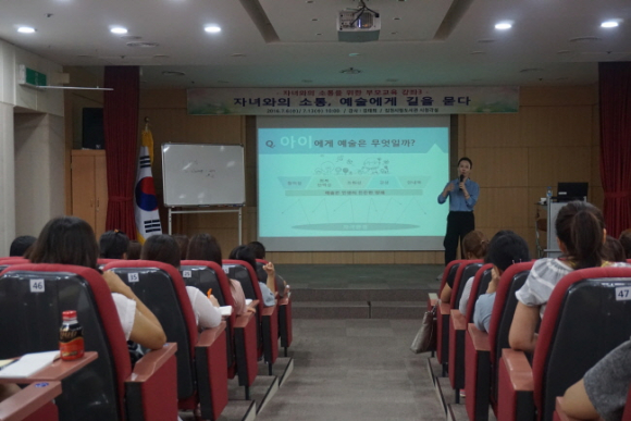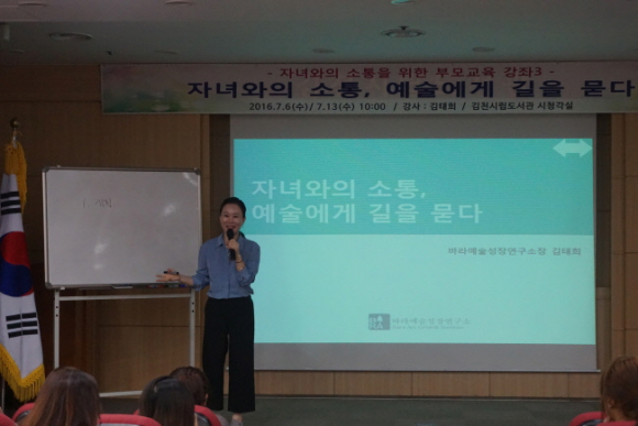 이번 강좌는 뮤지컬 기획자이자 바라예술성장연구소장인 김태희 강사가 강연을 맡아 ‘자녀와의 소통, 예술에게 길을 묻다’라는 주제로 진행되었다.