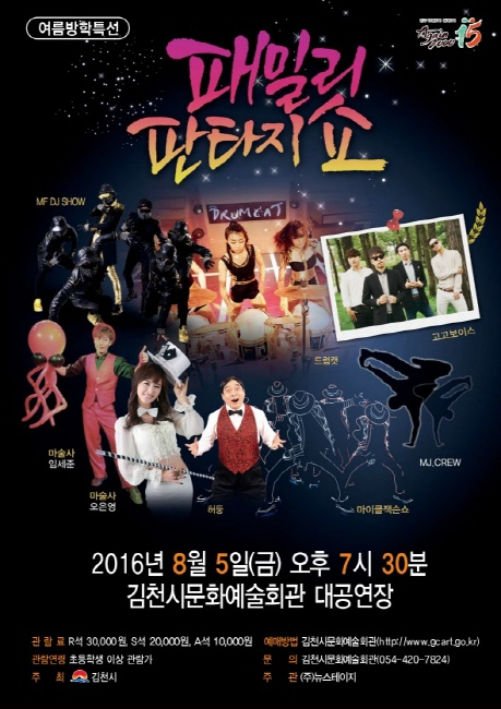 김천시문화예술회관(관장 장귀희) 대공연장에서는 2016. 8. 5일(금) 오후 7시 30분 여름방학을 맞이하여 온 가족이 즐길 수 있는 퍼포먼스 공연『패밀리 판타지 쇼』를 개최한다.