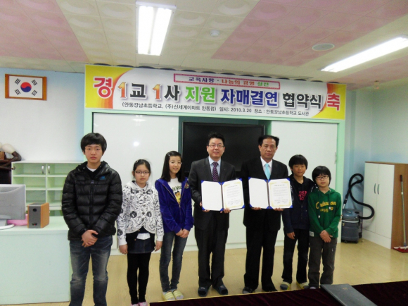 3월 20일(토) 11시 안동 강남초등학교 도서관에서 강남초등학교와 ㈜신세계 이마트 안동점(점장 박용일)이 1교 1사 자매결연 협약식을 맺어 교육공동체로서의 유대강화를 통해 행복과 사랑을 나누는 사회분위기 조성을 위해 상호 협력하기로 하였다.