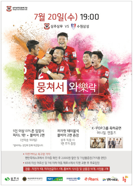 상주는 이번 홈경기에 경기력은 물론 이벤트까지 화끈하게 준비했다. 평일 저녁 직장인들이 많이 찾을 것을 감안한 ‘뭉쳐서 와樂’ 이벤트다. 5인 이상이 함께 EPL존(6문)으로 입장하면 피자헛 피자L 1판과 볼비어 2캔을 증정한다. 또한 피자헛 테이블석 예매자들에게는 볼비어 2캔을 증정하고 추가로 상주가 득점시마다 1캔을 증정한다.