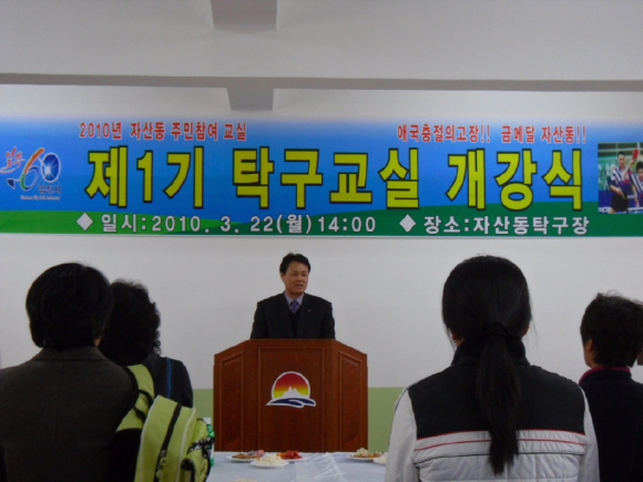 문상연 동장은 “자산동민을 위하여 프리테니스 교실, 기공생활체조 교실, 에어로빅․요가 교실에 이어 탁구 교실을 운영하게 되어 진심으로 기쁘게 생각한다. 탁구공 무게는 2.7그램이지만 탁구인이 느끼는 행복감은 2700톤쯤 되길 희망한다”고 말했다.