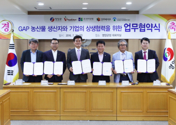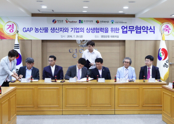 영양군(군수 권영택)은 7월 29일(금) 군청 소회의실에서 ㈜한미양행, 비타민하우스(주), ㈜천호바이오, (사)토종명품화사업단의 주요관계자가 참석한 가운데 GAP농산물 생산자와 기업의 상생협력을 위한 업무협약을 체결했다고 밝혔다.