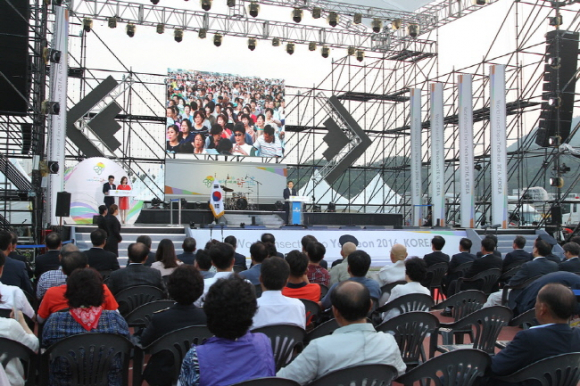 신명 나는 거리 퍼레이드와 전자 타악 공연으로 축제 열기를 돋운 뒤 시작된 이날 공식 행사는 사회자의 개식 인사를 시작으로 황교안 국무총리, 김관용 경상북도지사, 이현준 조직위원장 등 주요 인사들의 개막 축하 연설이 이어졌으며, 마지막으로 엑스포 시작을 알리는 화려한 ‘버튼 터치 세레모니’로 공식 행사 일정이 마무리 됐다.