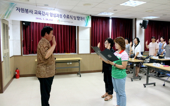 상주시종합자원봉사센터(센터장 박경문)는 7월 29일(금) 자원봉사 교육강사 양성과정을 이수한 자원봉사자를 대상으로 수료식 및 발대식을 가졌다. 7월 18일(월)부터 7월 28일(목)까지 진행된 이번 교육은 교육강사에 관심이 있는 자원봉사자 25명을 대상으로 청소년 자원봉사 기초이론 및 참여형 체험교육 기법을 습득하는 방식으로 진행되었다.