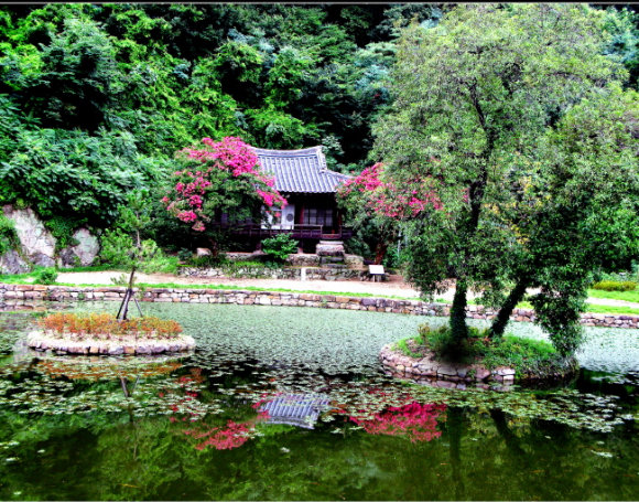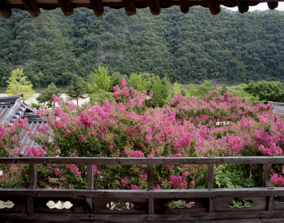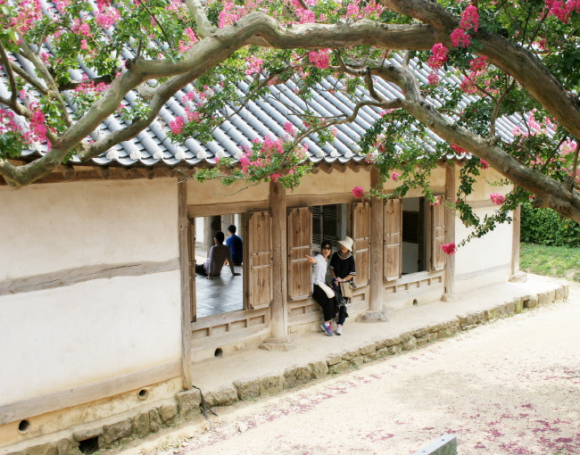 고풍스런 서원정자와 분홍빛 배롱나무의 만남